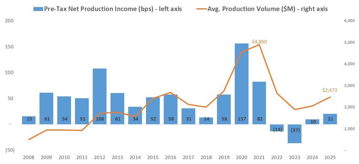 * In basis points, the average production income was 21 basis points in 2025, up from an average of 10 basis points in 2024. Since the inception of MBA’s Annual Performance Report in 2008, net production income by year has averaged 45 basis points ($1,031 per loan).