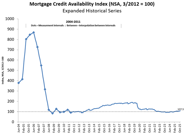 The Total MCAI has an expanded historical series that gives perspective on credit availability going back approximately 10-years (expanded historical series does not include Conventional, Government, Conforming, or Jumbo MCAI). The expanded historical series covers 2004 through 2010 and was created to provide historical context to the current series by showing how credit availability has changed over the last 10 years – including the housing crisis and ensuing recession. Data prior to March 31, 2011 was generated using less frequent and less complete data measured at 6-month intervals and interpolated in the months between for charting purposes. Methodology on the expanded historical series from 2004 to 2010 has not been updated.