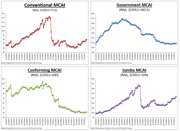 The Conforming and Jumbo indices have the same “base levels” as the Total MCAI (March 2012=100), while the Conventional and Government indices have adjusted “base levels” in March 2012. MBA calibrated the Conventional and Government indices to better represent where each index might fall in March 2012 (the “base period”) relative to the Total=100 benchmark.